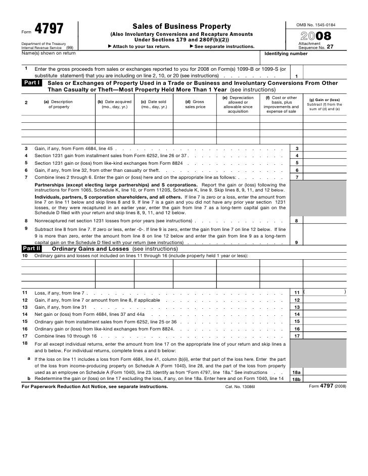 Form 4797 Department of the Treasury Internal Revenue Service Sales of Business Property (Also Involuntary Conversions and Recapture Amounts Under Sections 179 and 280F(b)(2)) Attach to your tax return Go to wwwirsgov/Form4797 for instructions and the latest information OMB No Attachment Sequence No 27 Name(s) shown on returnForm 4797 is intended for use as a means of reporting a business property sale Any individual who sold a business property or traded the business property during that tax year must complete this form The definition of property for the purposes of this form isn't limited to inhabitable land but also can include oil or mineral properties2 Depreciable and amortizable tangible property used in your trade or business (however, see Disposition of Depreciable Property Not Used in Trade or Business, later);